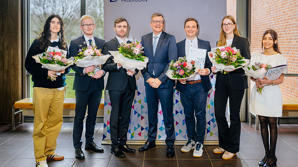 Photo (University of Paderborn, Besim Mazhiqi): Prof. Dr. Andreas Siebe (centre) with the University Society award winners, Niklas Lamberty third from left.